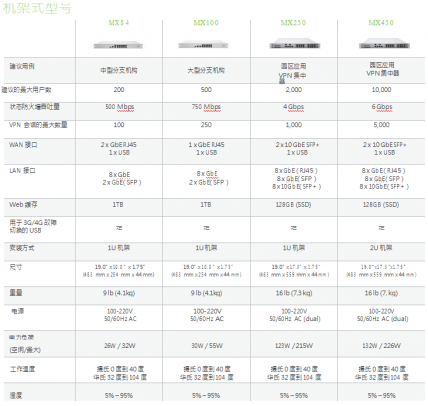 Cisco Meraki MX84、M100、MX250 和 MX450 型號(hào)支持熱插拔光模 塊,后者用于在配線柜和聚合交換機(jī)之間建立高速骨干連接。