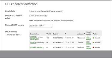 Meraki 交換機(jī)還提供全面的安全報(bào)告, 便于您主動(dòng)發(fā)現(xiàn)非 法 DHCP 服務(wù)器以及網(wǎng)絡(luò)中的其它惡意活動(dòng)。