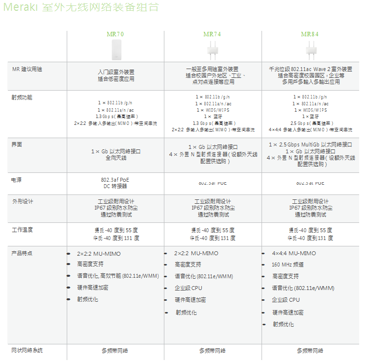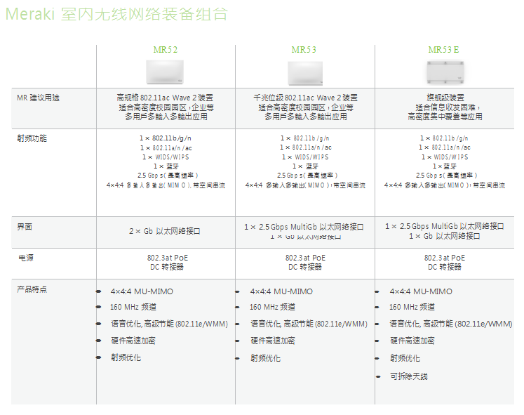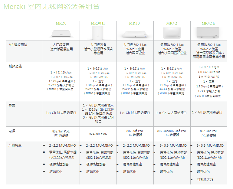 Meraki MR無線接入點系列包含現(xiàn)代企業(yè)級所需的所有以太網絡特性,其中包括: